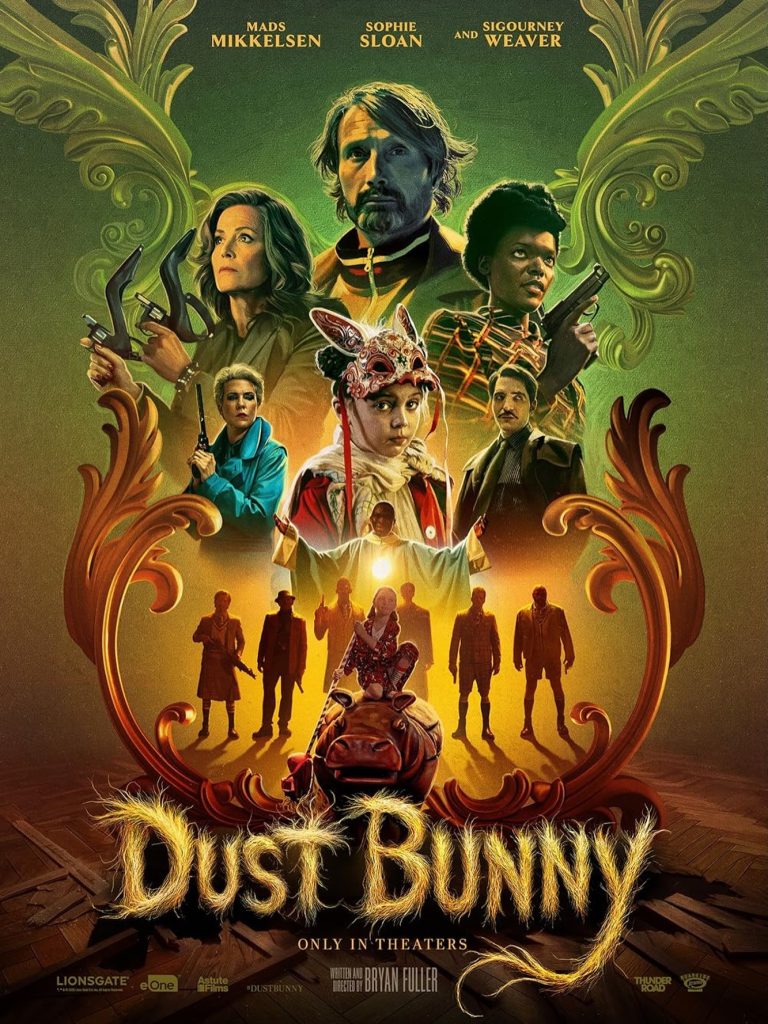 Eight year old Aurora (Sophie Sloan) is living with her latest foster family when she manifests a dust bunny (a clump of hair under her bed) into an actual monster. Feeding on her trauma, the creature grows into an imposing beast and devours anyone who walks on the floor of her apartment – picture a raging rabbit version of Carol from ‘Where the Wild Things Are’. Aurora reaches out to her neighbour from down the hall ‘Resident 5B’ (Mads Mikkelsen), a middle aged professional assassin, and hires him to eliminate it using money she stole from a church collection plate. R5B has his own problems and is the target of a rival group of hitmen, resulting in him simultaneously hunting a supernatural monster for a child while being hunted himself by real and dangerous killers. Sigourney Weaver makes a guest appearance as Laverne, R5B’s ruthless advisor. Her heartless character has some of the best lines. There isn’t a huge amount of dialogue between everyone else, just enough to fill gaps and push the momentum. While the subject matter might sound cute thanks to the dust bunny premise, the action sequences are not for kids. Most of the fight scenes take place in the small hallways of Aurora’s apartment and are very creatively choreographed to fit into such tight spaces. Using old school practical animation and puppetry, with a bit of CGI thrown in, the creature always comes across as slightly endearing, no matter how ferocious it looks and despite being 12 feet tall. Shot in a super slim ratio of 3:1, the panoramic letterbox format emphasises the actors yet also encourages you to scan every frame. There are elements of Wes Anderson in the hyper-stylised, symmetrical set design and meticulously crafted colour palettes, only here they result in a grim storybook aesthetic. Imaginative, quirky, and fun … just stay off the floor!